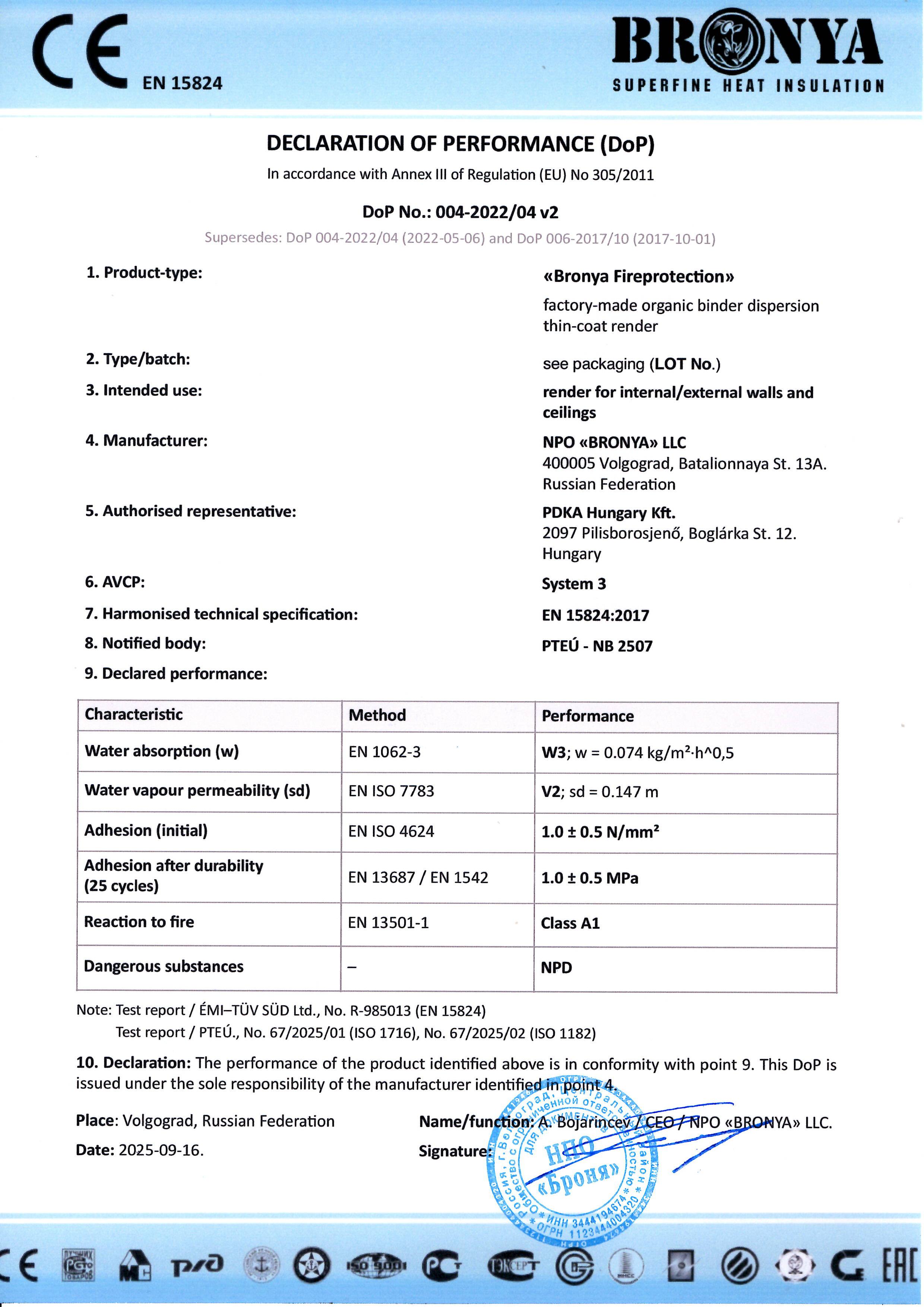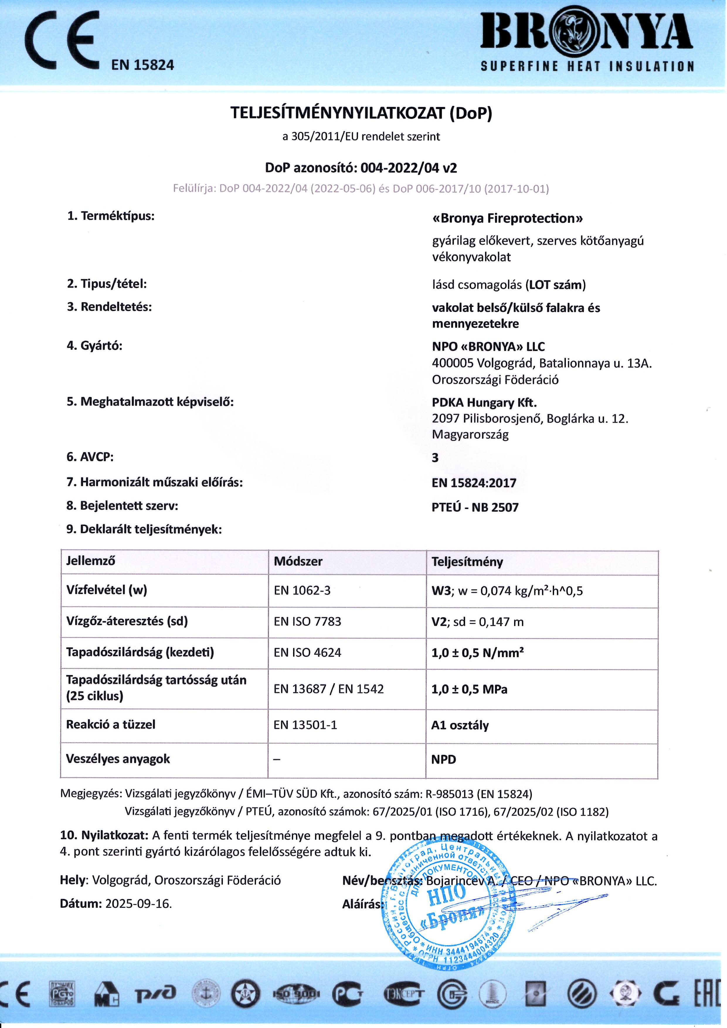 Сертификат СЕ на Броня Огнезащита в Европейской лаборатории по стандарту EN 15824