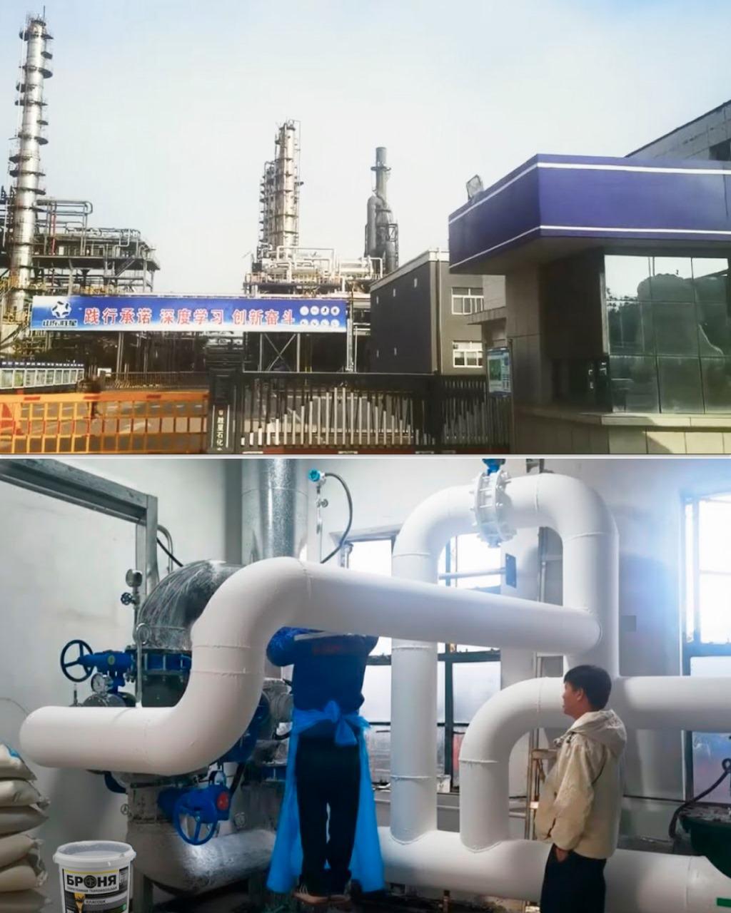 Depending on the temperature, ranging from +80°C to +160°C, a total coating thickness of 2 to 4 mm was used. First, layers of "Bronya Antirust NF" were applied to ensure anti-corrosion protection. Then, following a mandatory 24-hour inter-layer drying period, "Bronya Classic NF" was applied to achieve the required thermal insulation characteristics. Given the small diameter of the pipelines, the application was carried out using the manual method.