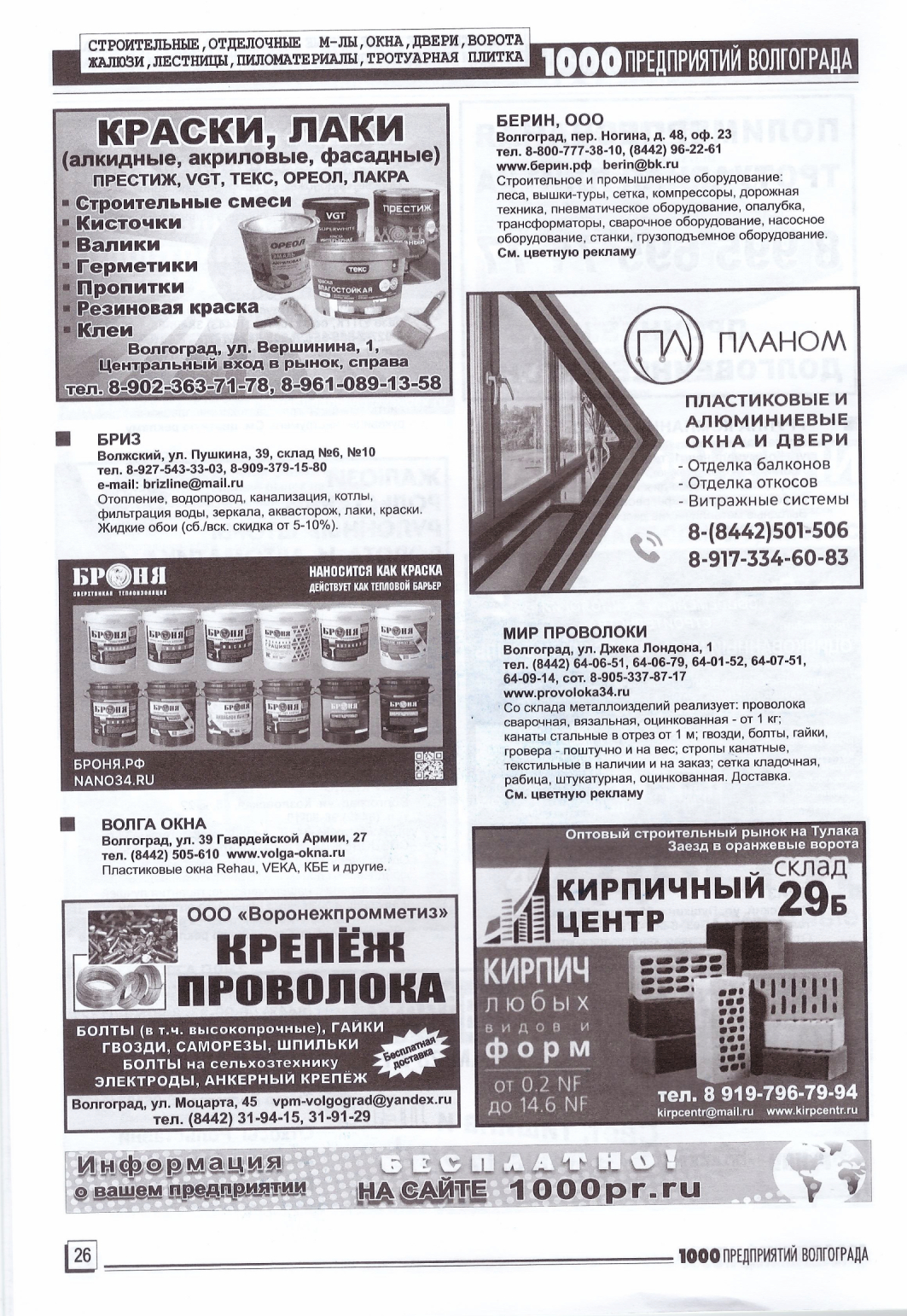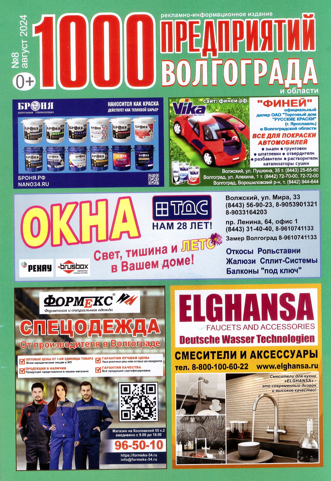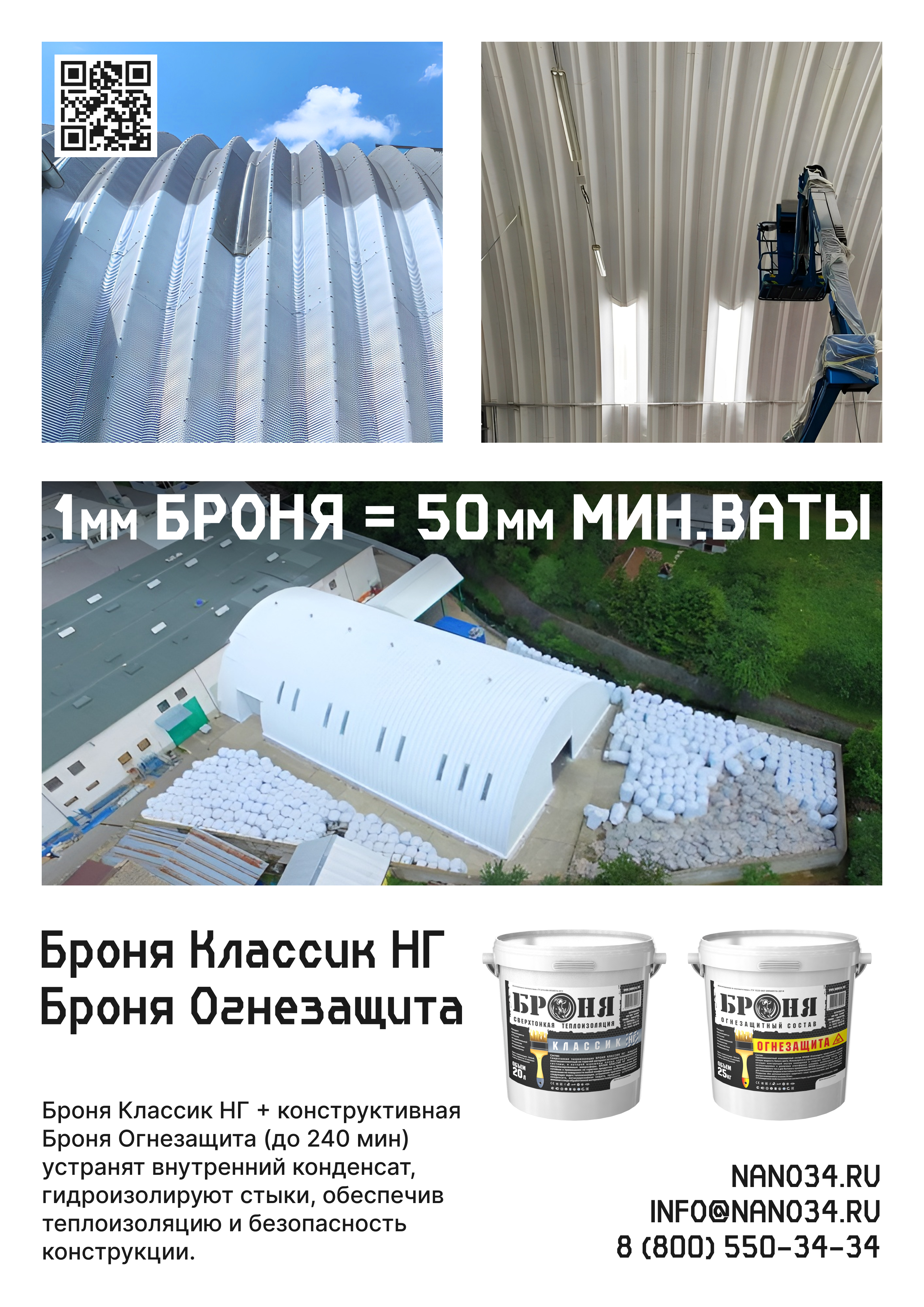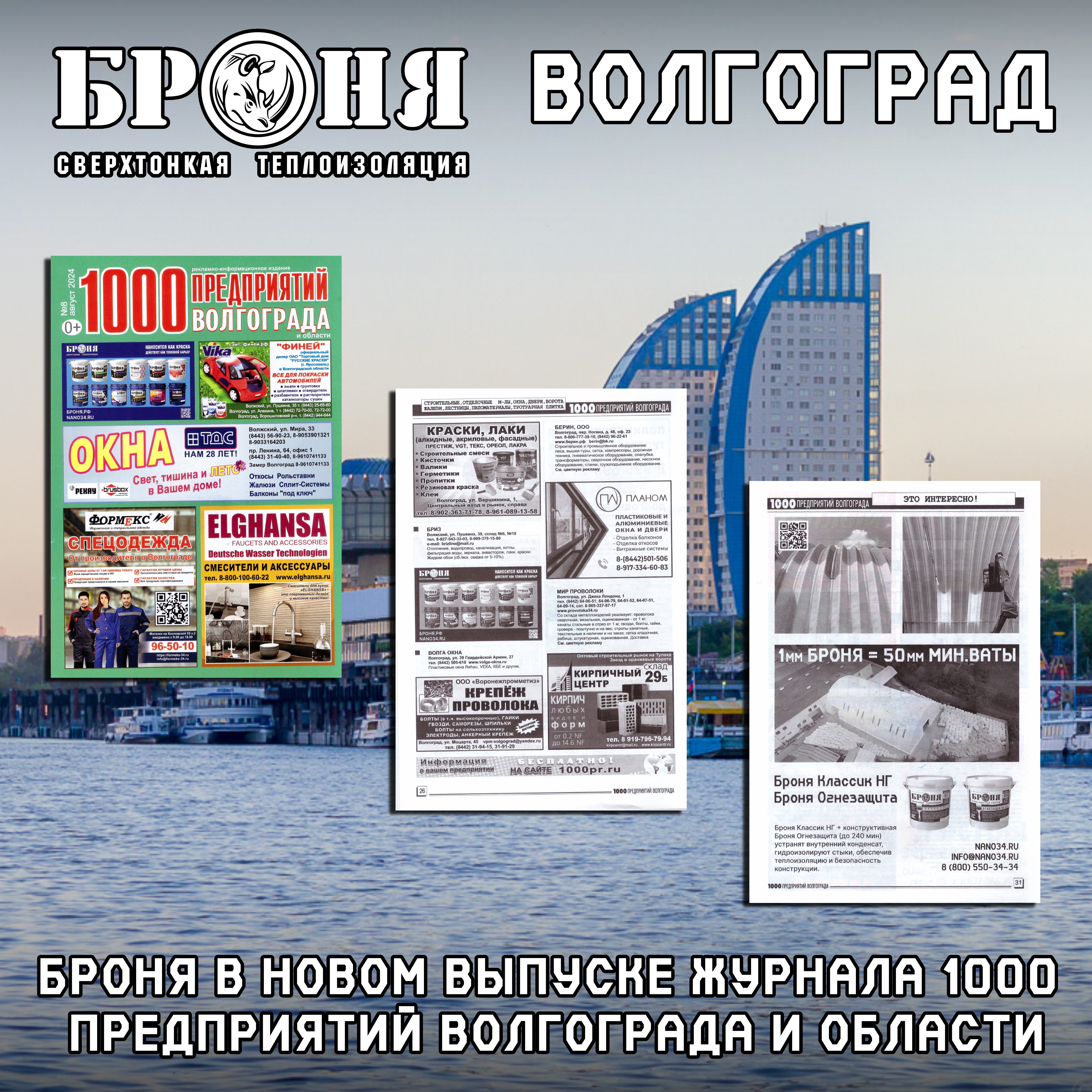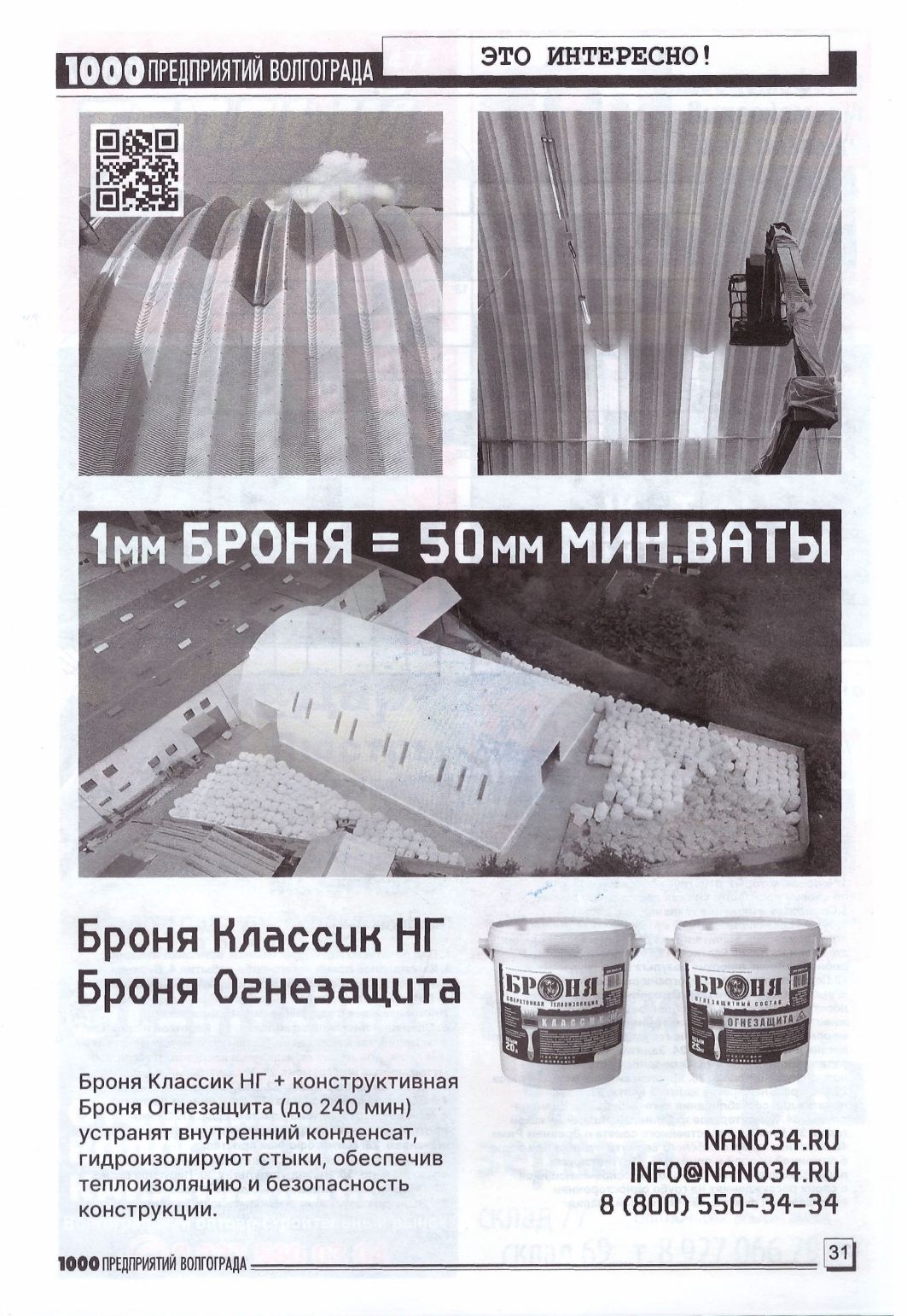 NPO Bronya continues its cooperation with popular publications, such as the information and reference magazine "1000 enterprises of Volgograd and the region", where a mock-up with thermal insulation Bronya is placed on the first cover and one of the pages of the magazine, as well as an advertising banner with our patented constructive fire protection system and an example of application for thermal insulation of hangars of the Nestle plant in the Czech Republic.