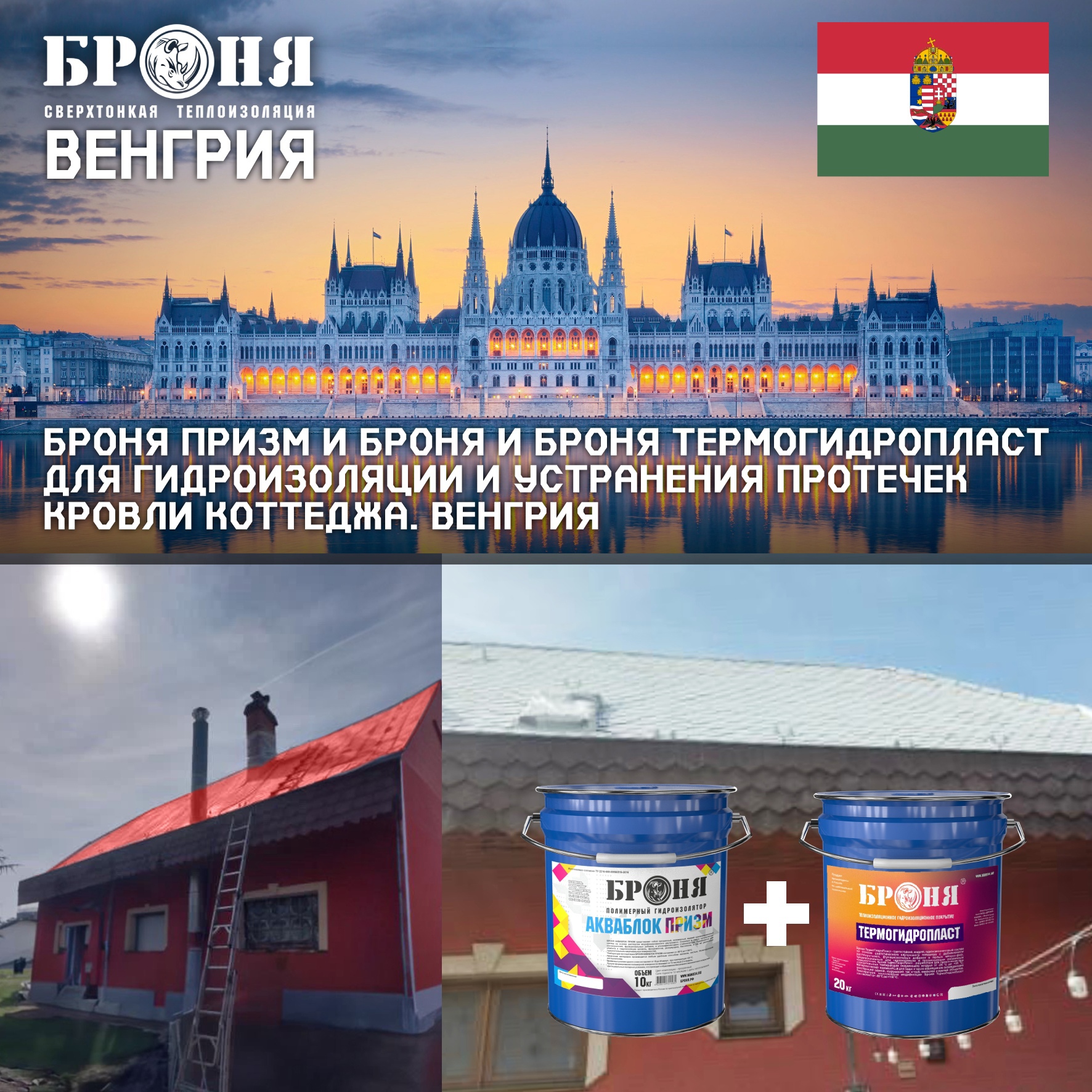 We present to you a comprehensive application of our dual-purpose rubber materials – “Bronya Prizm” and “Bronya TermoGidroPlast” – on the roof of a countryside cottage in Hungary. Several tasks were addressed.