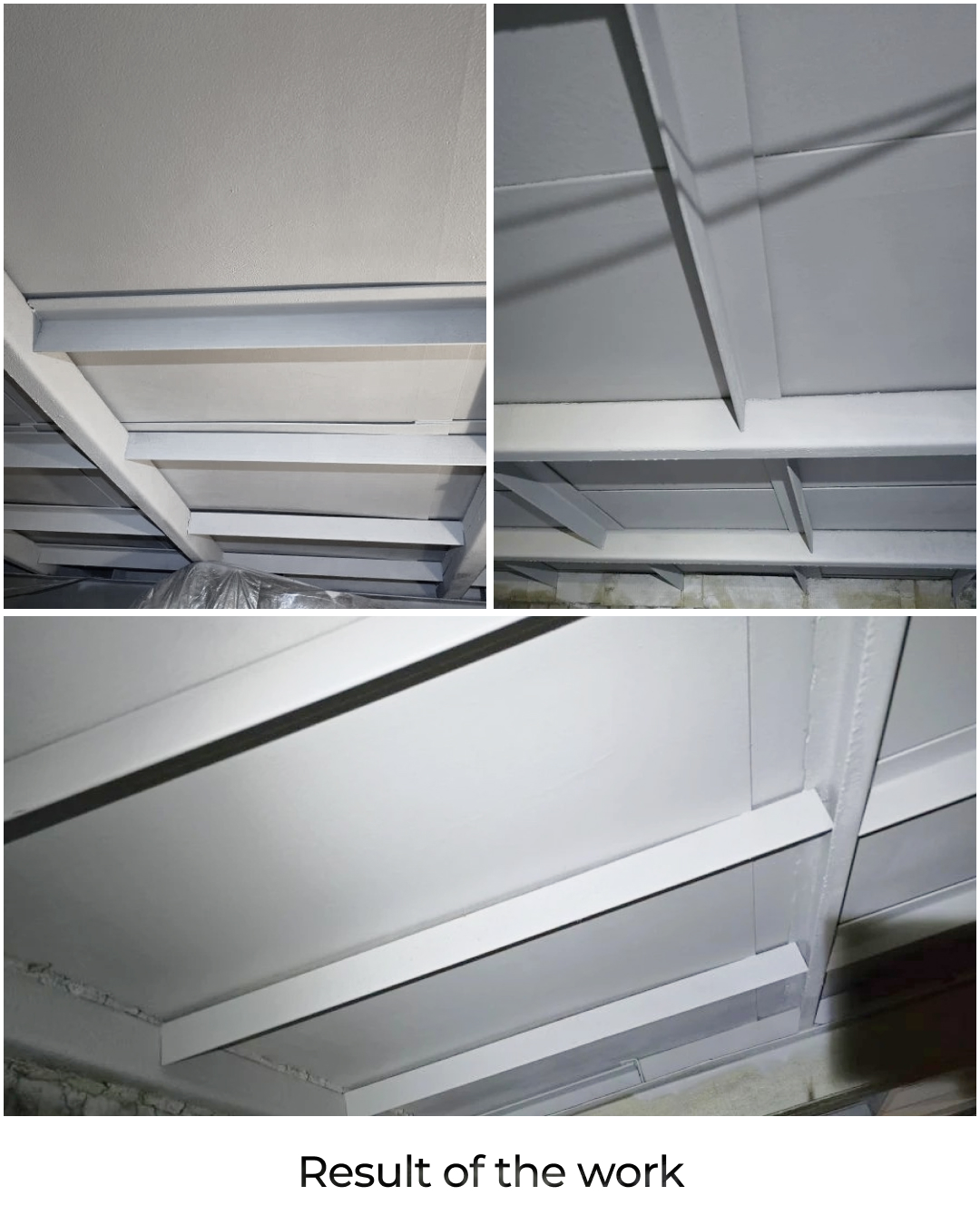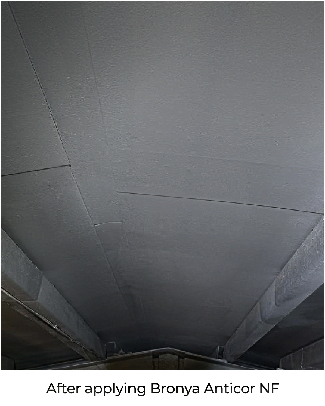 The metal elements of the roof truss system showed signs of severe corrosion before work began. To solve this problem, a tremendous amount of work was carried out, applying a total of 8 layers of two of our modifications: "Bronya Anticor NF" and "Bronya Classic NF" using the airless spray method. The "Bronya Anticor NF" modification has anticorrosion, thermophysical, and non-flammable properties. Preliminary preparation in the form of removing loose, flaking rust, treating the surface with a rust converter, and then applying the material in 2 layers of 0.5 mm each ensured maximum adhesion, stopped further corrosion spread, and created a primary fire protection and thermal insulation barrier.
