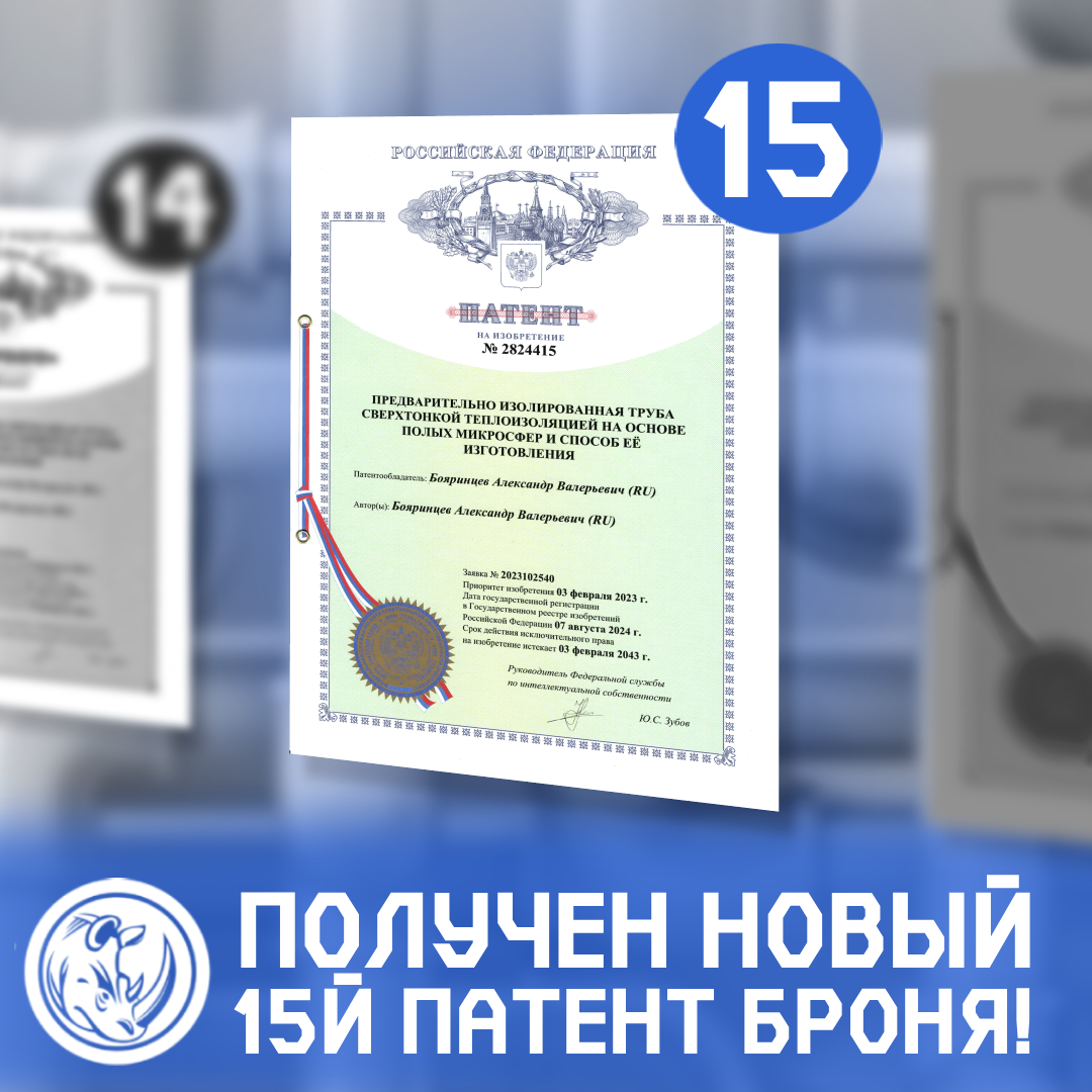 We have another great news! We have received a new patent, the 15th anniversary patent for the invention "Pre-insulated pipe with ultrathin thermal insulation based on hollow microspheres and a method for its manufacture". We get them so often, if you follow our news feed, you may get the impression that this has become some kind of ordinary or ordinary event.