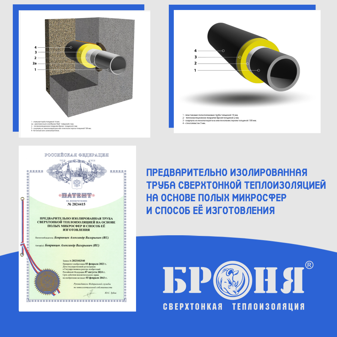 important! The 15th Bronya patent was obtained: "Pre-insulated pipe with ultrathin thermal insulation based on hollow microspheres and the method of its manufacture" (Scan of patent No. 2824415)