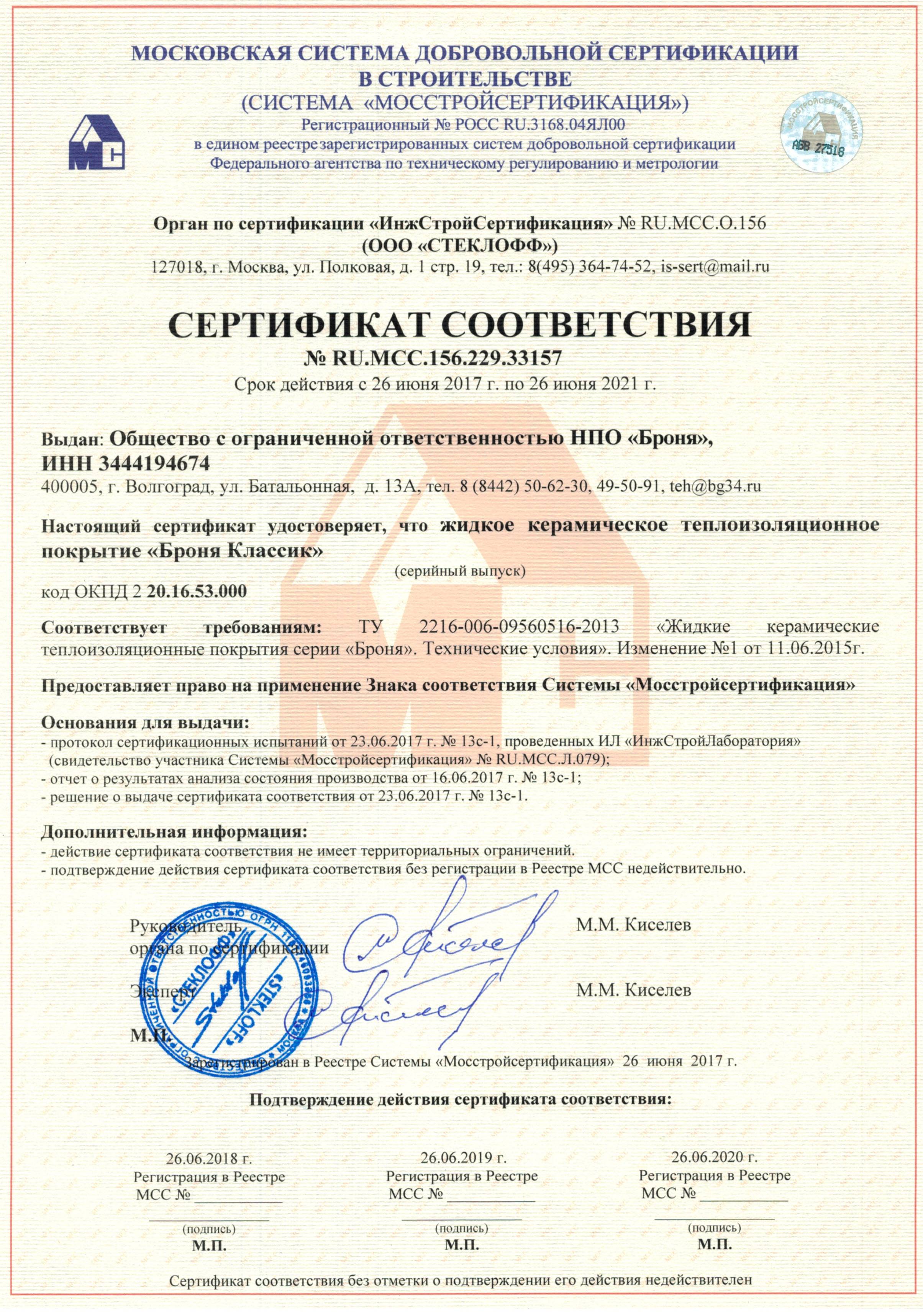 MosStroySertifikatsiya Extends Certificates for All Modifications of Bronya Liquid Ceramic Thermal Insulation - 2015