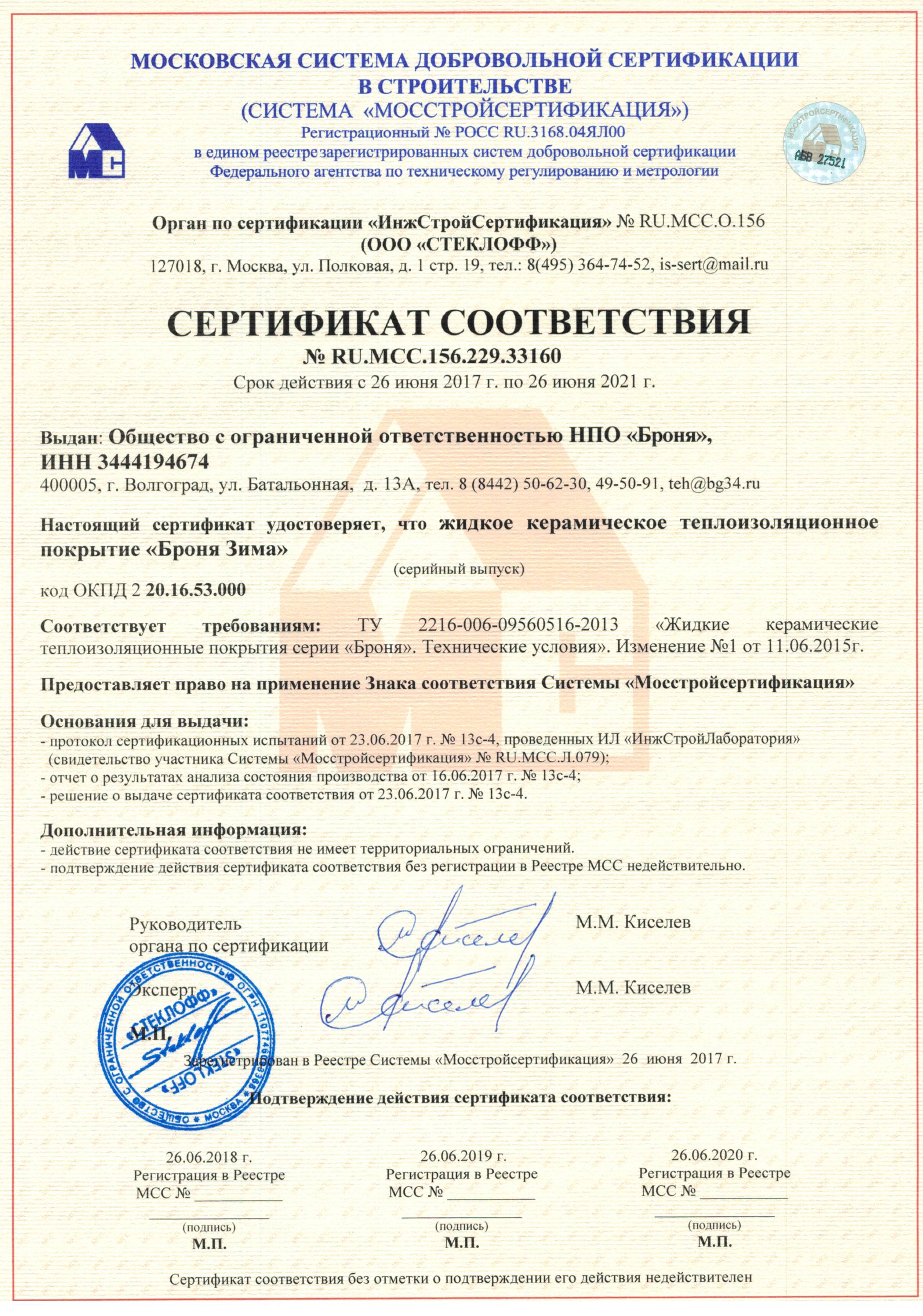The VIRC Bronya Group of Companies has successfully completed the re-certification process within the MosStroySertifikatsiya system, and has been issued separate certification forms for the different modifications of Bronya liquid ceramic thermal insulation.