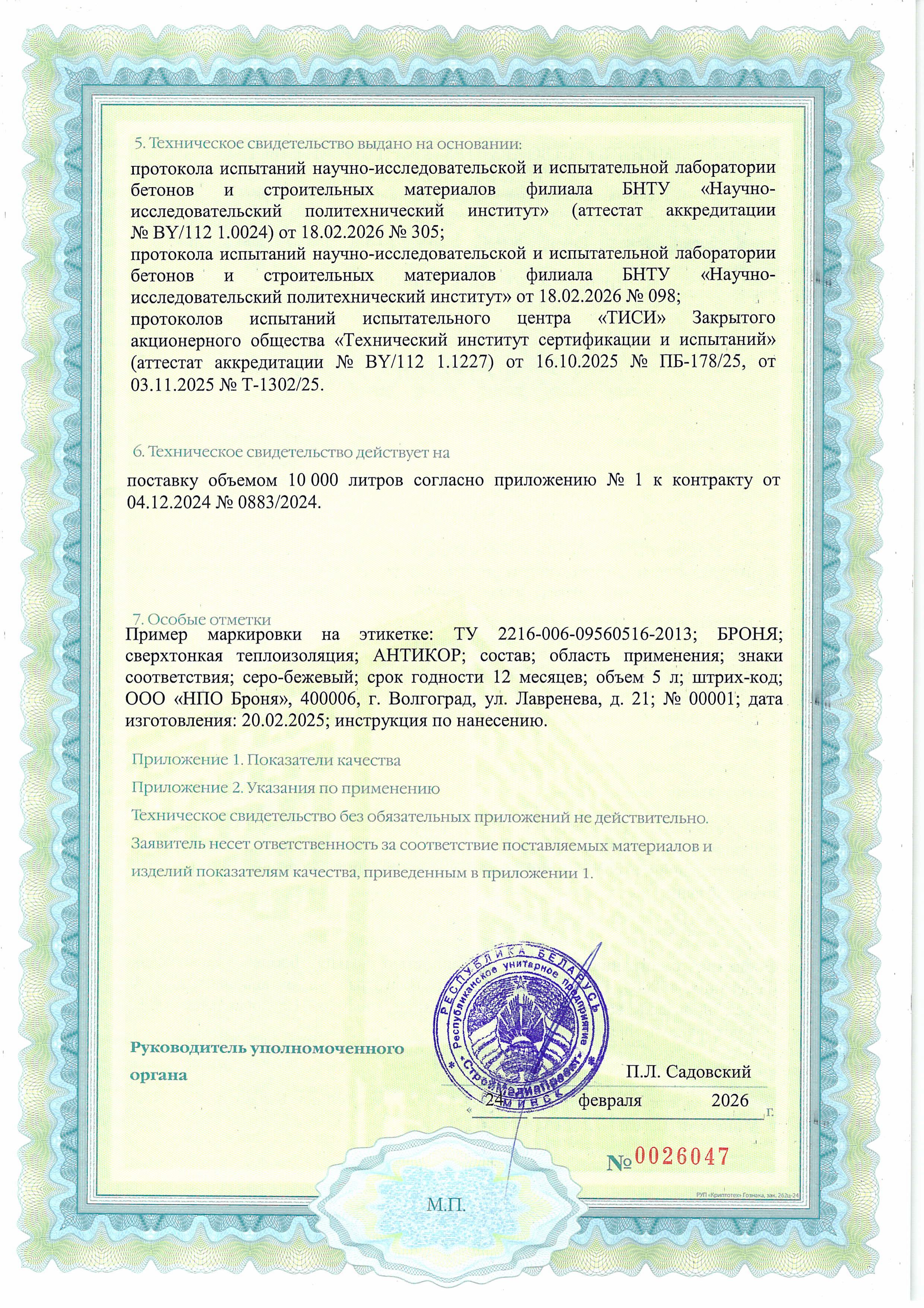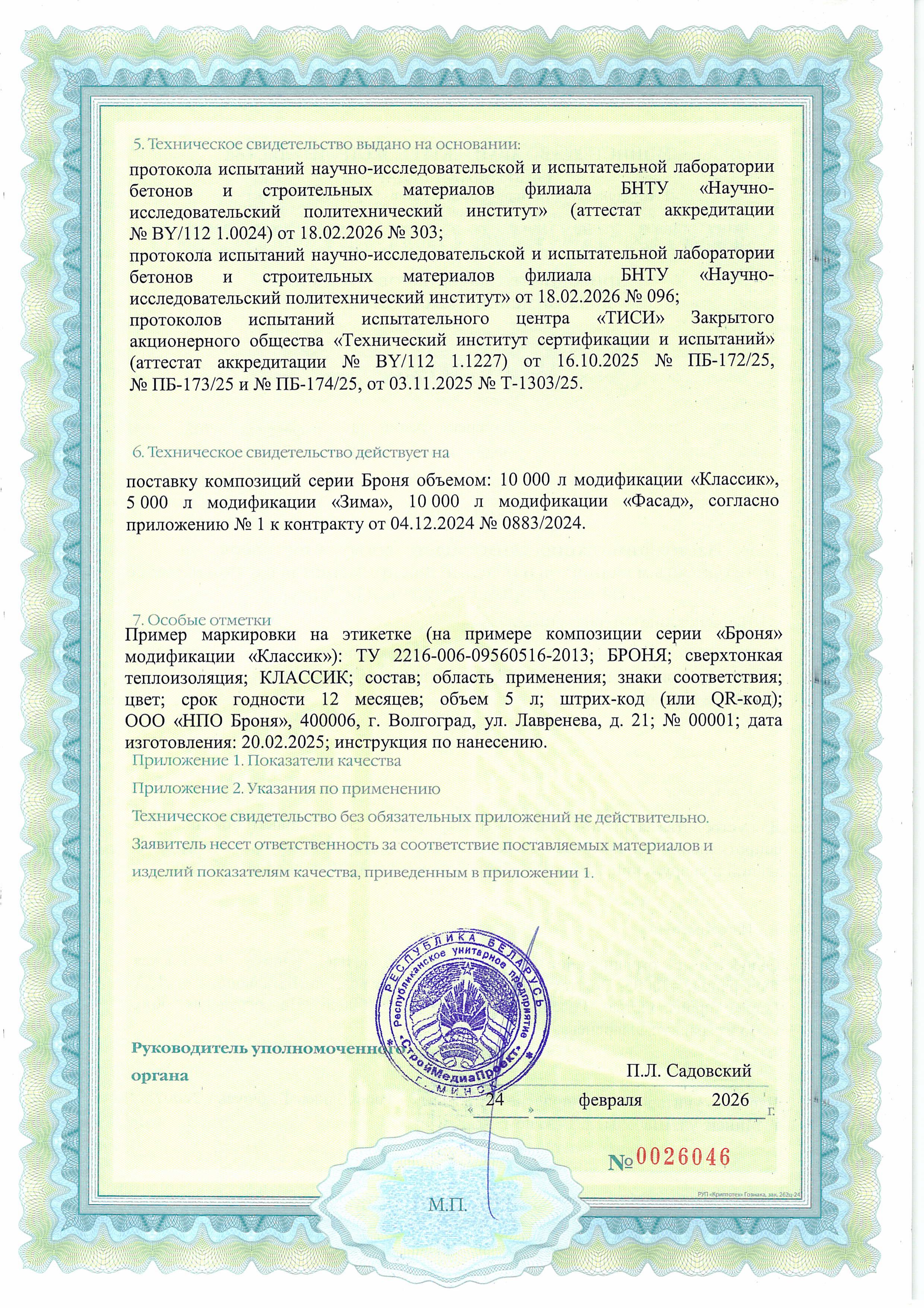 We congratulate everyone on this excellent news! Our official dealer in the Republic of Belarus (Private Unitary Enterprise "Dilevit") has carried out tremendous work, resulting in the successful acquisition of 2 Technical Certificates from the Ministry of Architecture and Construction of the Republic of Belarus for a total of 4 modifications (the "Bronya" series of modifications "Classic", "Facade", "Winter", and "AntiRust").