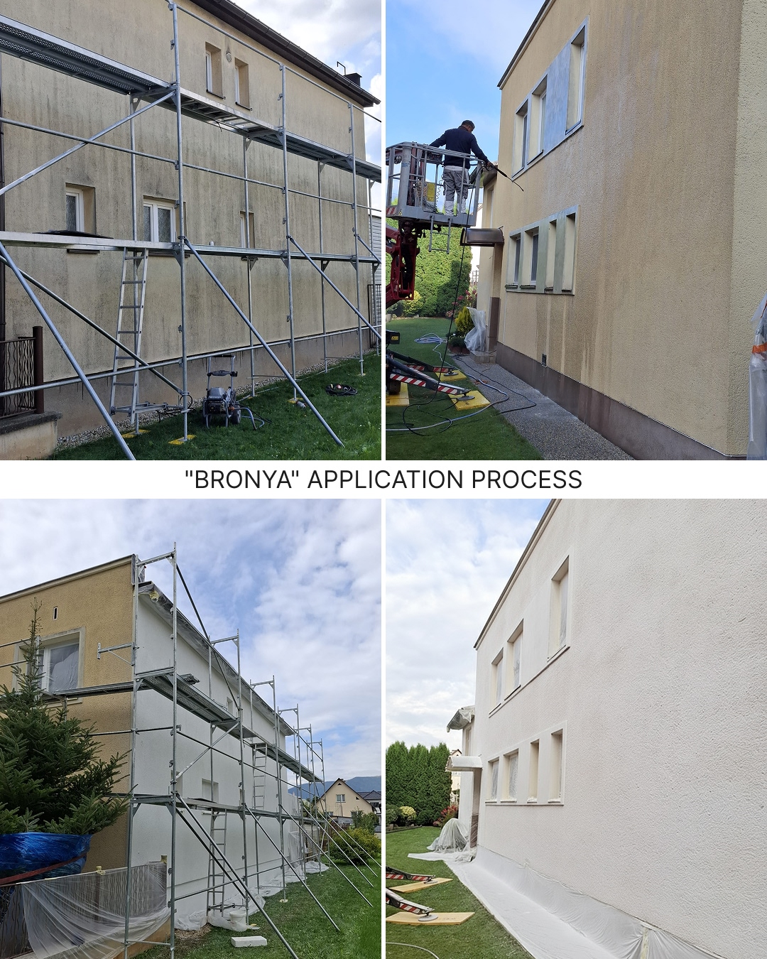 Process: To create a durable and clean coating, the facade was thoroughly cleaned using a pressure washer. Then, using an airless sprayer, 4 layers of "Bronya Facade NF" non-combustible thermal insulation were applied.