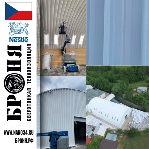 The topic of today's news post is the thermal insulation of two of the 13 Nestle hangars with the help of Bronya Classic NG. Previously, the surface of the hangars made of galvanized sheets was degreased, dust-free and primed with epoxy primer, then 1.5 mm Bronya Classic NG was applied, the material was applied in 3 layers of 0.5 mm. Already now, in the process of coating steel hangars, positive feedback is received from the customer. In hangars covered with Bronya Classic NG, electricity consumption for air conditioning has decreased by 30%.