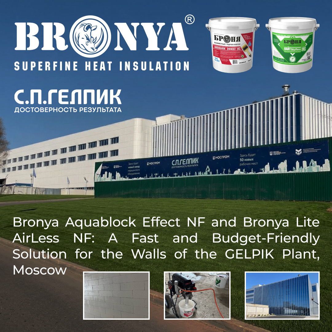 During the construction of the new medical equipment plant "GELPIK" in Moscow, it was important to find an alternative to the classic finishing of aerated concrete partitions. This task required taking several factors into account at once: thermal insulation, sound insulation, non-flammability, environmental compliance — and all without reducing the usable floor space. This is why the decision was made to use modern materials that simultaneously act as thermal insulation, waterproofing, soundproofing, plaster, and finishing coating, while also having confirmed non-flammability. A successful solution was the thermal and sound insulating putty "Bronya Lite AirLess NF", applied directly onto the aerated concrete blocks, as well as the polymer waterproofing material Bronya Aquablock Effect NF, which meets environmental safety requirements throughout its entire life cycle and bears the "Leaf of Life" ecolabel. The environmental friendliness of the materials was a fundamental factor for the customer in deciding to use Bronya coatings.