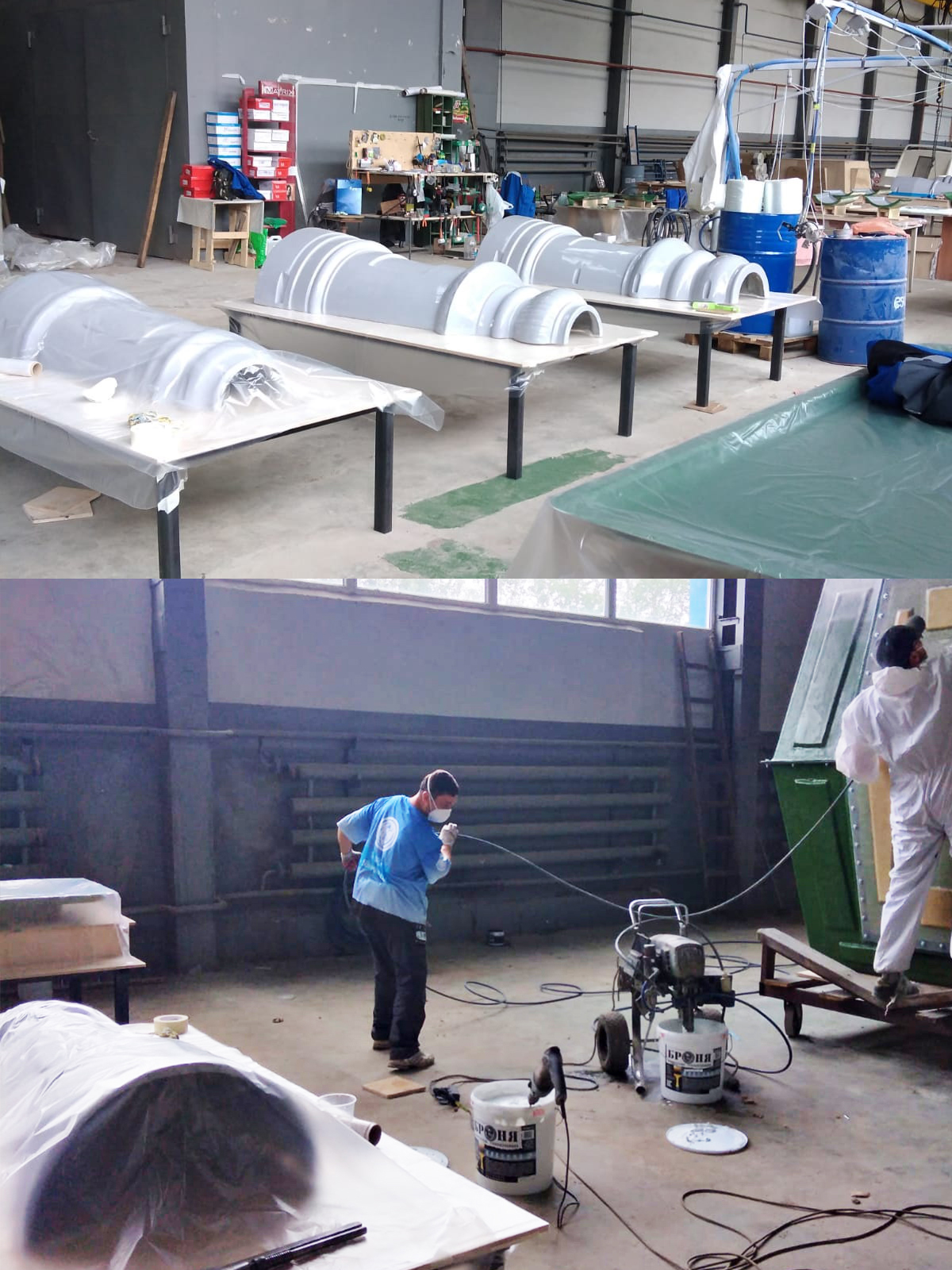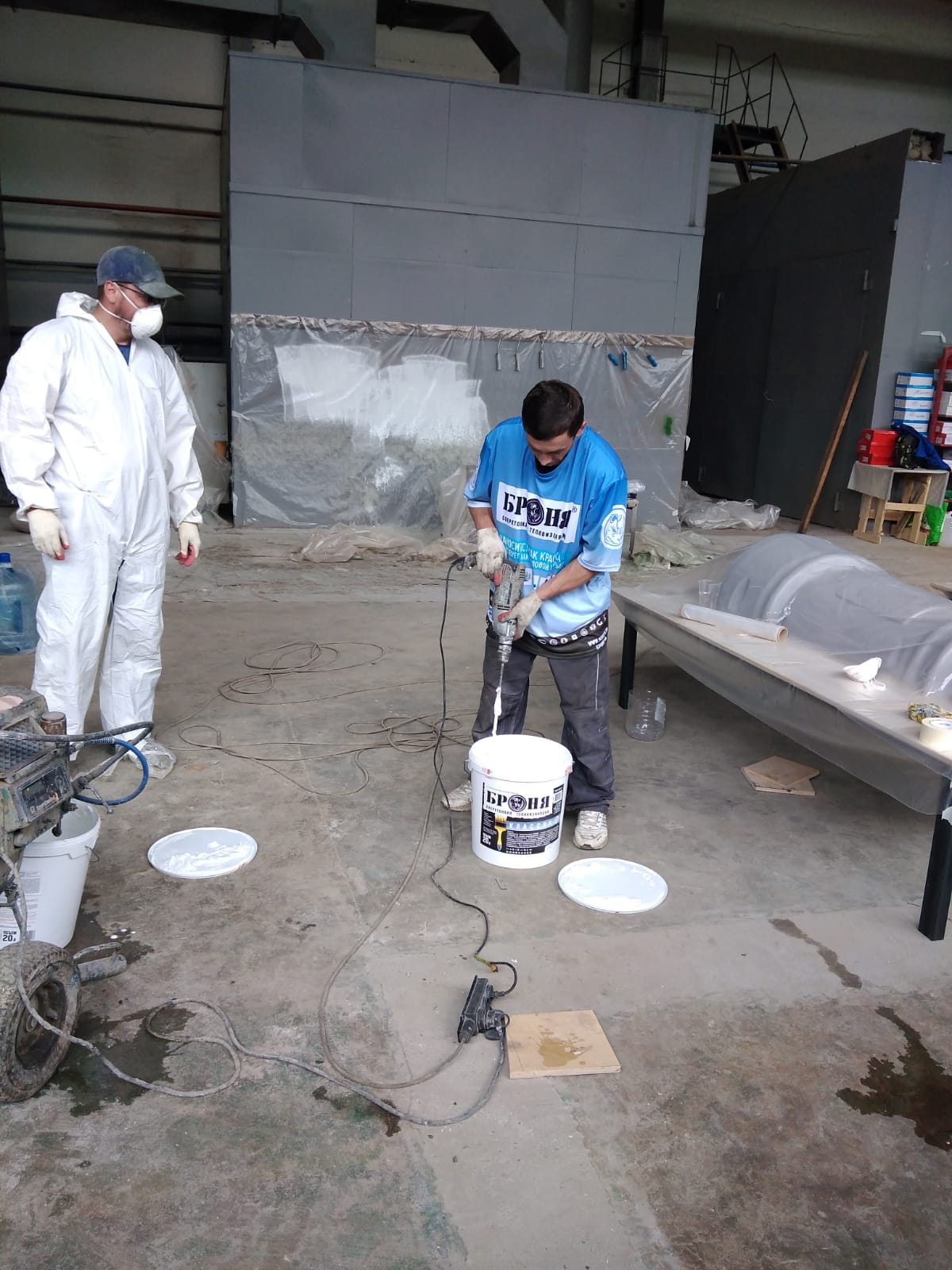 The result was a previously unseen level of adhesion to this type of composite material, thermal insulation comparable to 8-10 centimeters of mineral wool, non-combustibility, the elimination of internal condensation, and of course, the important safety aspect of certified non-combustibility. It should be noted that these structures are produced on an industrial scale, both for civilian enterprises (for example, for rotational worker camps) and for the army, as part of state defense orders. The materials were supplied by our distributor "Bronya Kostroma," who also took on the contract for the application on a permanent and industrial basis in the client's production cycle workshop.