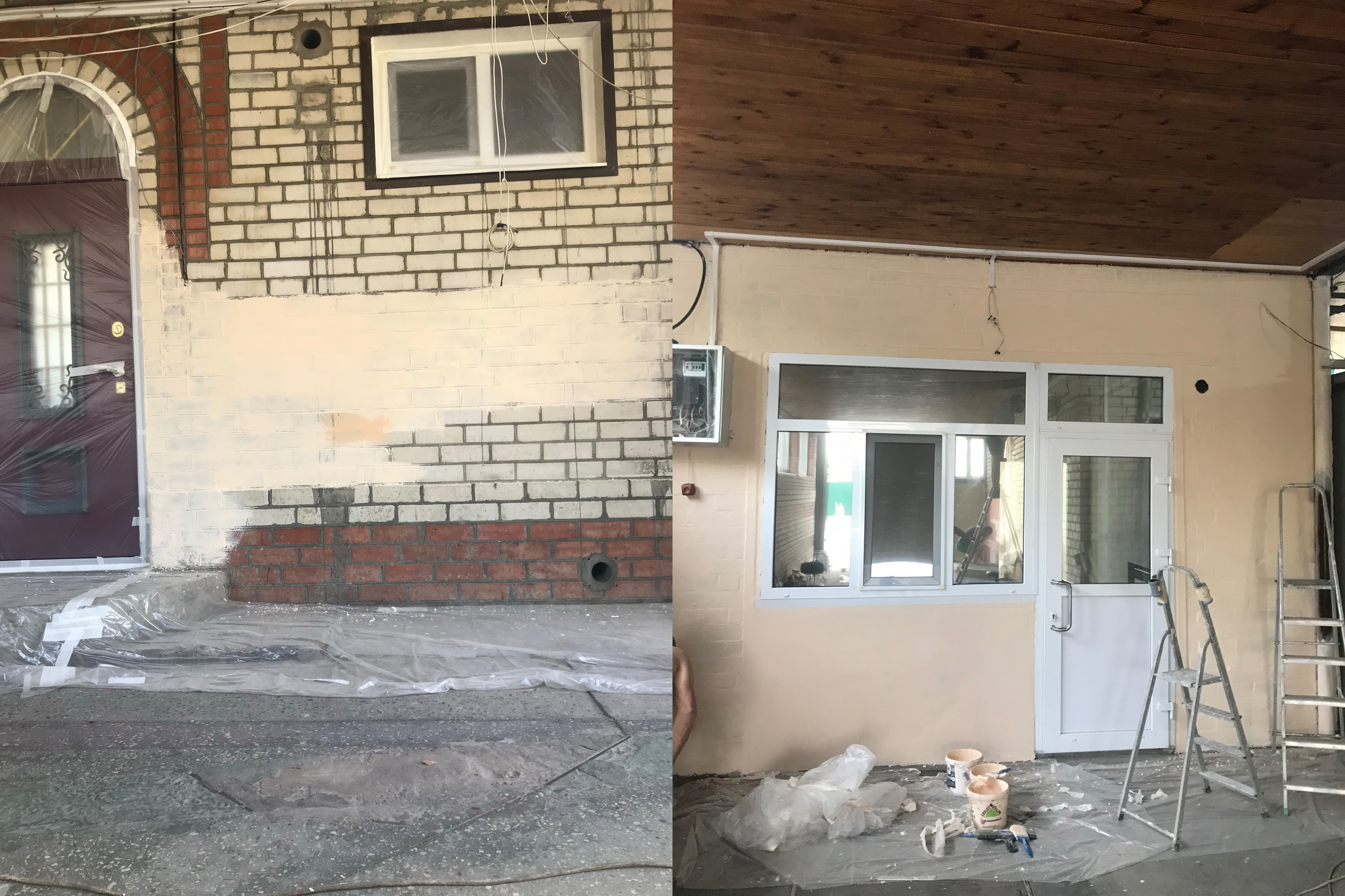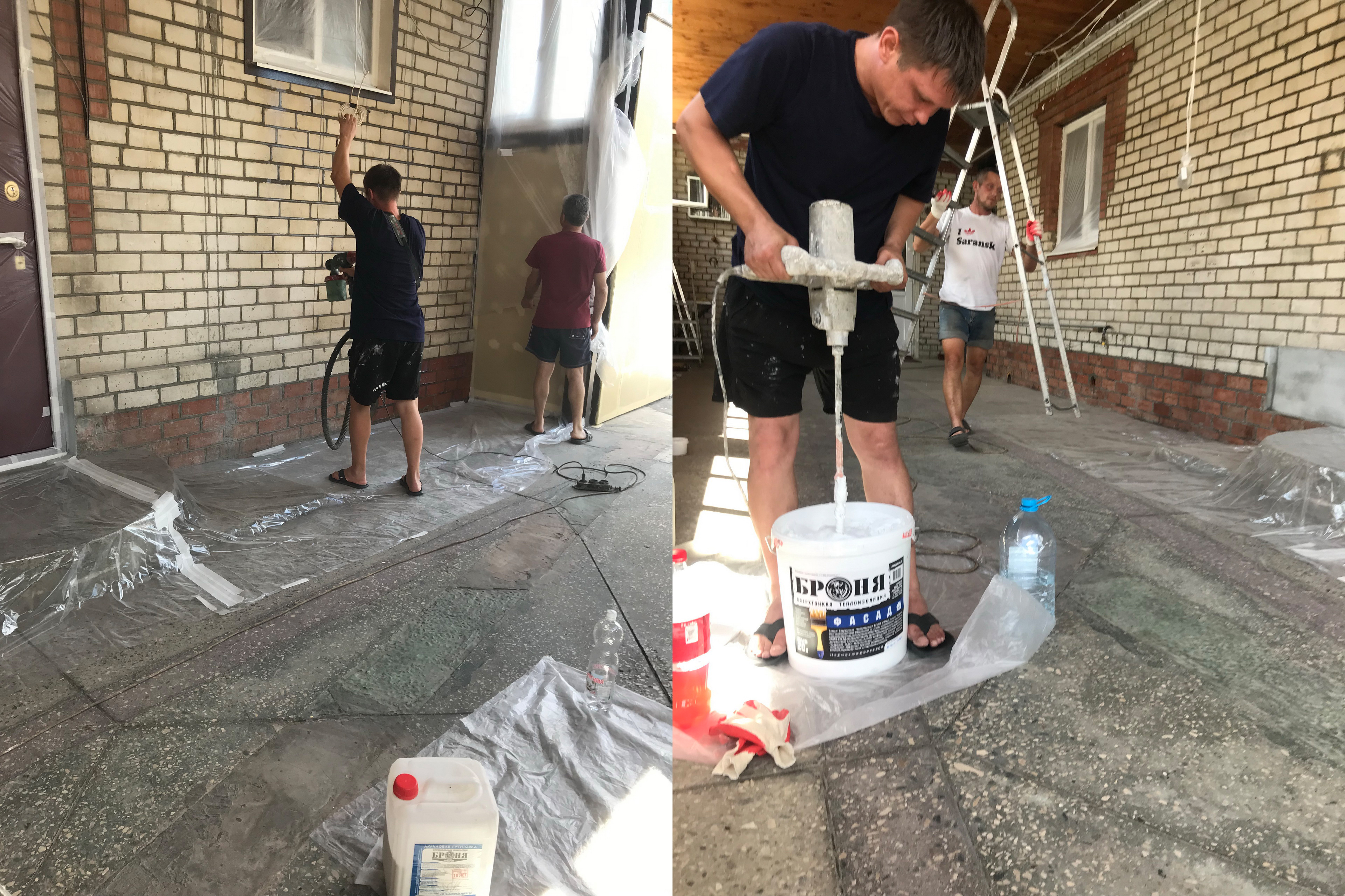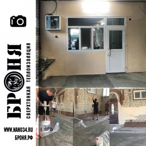 Before applying thermal insulation, the walls were cleaned, drained and covered with deep penetration soil! Then, using an ordinary paint brush, thermal insulation Bronya Facade was applied with the addition of color, in two layers of 0.7-0.8 mm each, with interlayer drying for 24 hours! The total thickness of the insulation was 1.5 mm.!