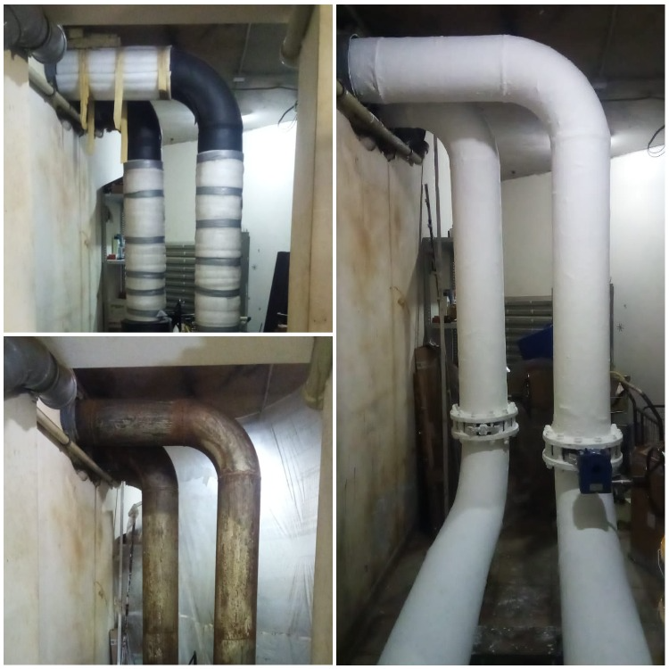 The pipe section, which included the section of valves and all kinds of valves, produced a large amount of condensate up to the flooding of the room, the old insulation with which the pipes were covered did not give the desired result, and corrosion formed at the pipe seams, in some places the pipes rusted very strongly and the situation is almost critical. Bronya materials were adopted to correct the situation, namely the complex use of modifications Bronya Anticorrosive and Bronya Classic, this is an ideal option suitable for protecting the surface from corrosion, combating it and thermal insulation of the entire pipeline assembly. Before application, the pipes were completely cleaned from the old thermal insulation, the surface was carefully cleaned and degreased. then the pipes were reinforced with sickle mesh, and only after that they started applying the material. This mesh technique eliminates the need for preliminary, more thorough stripping.