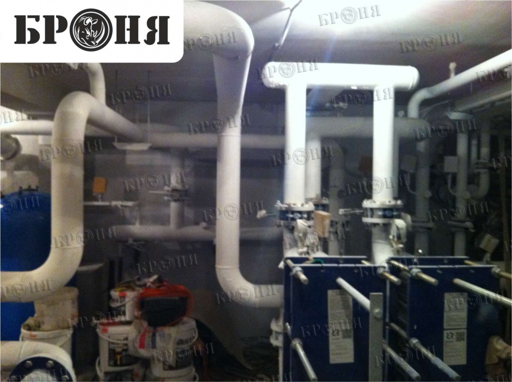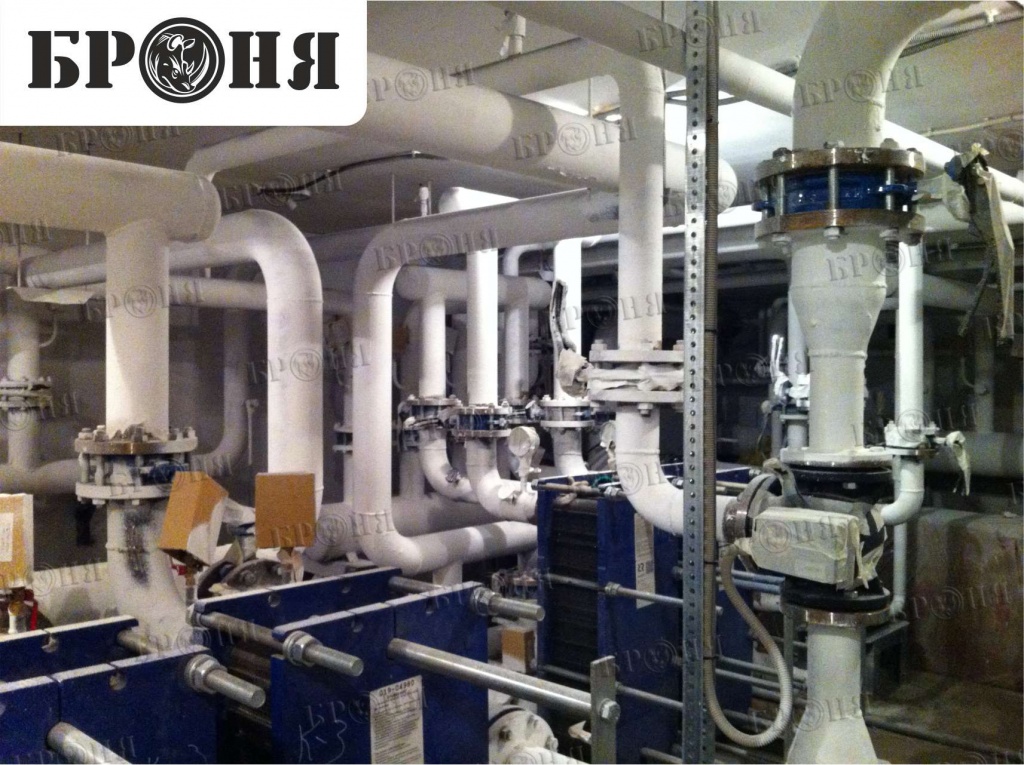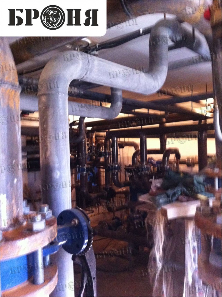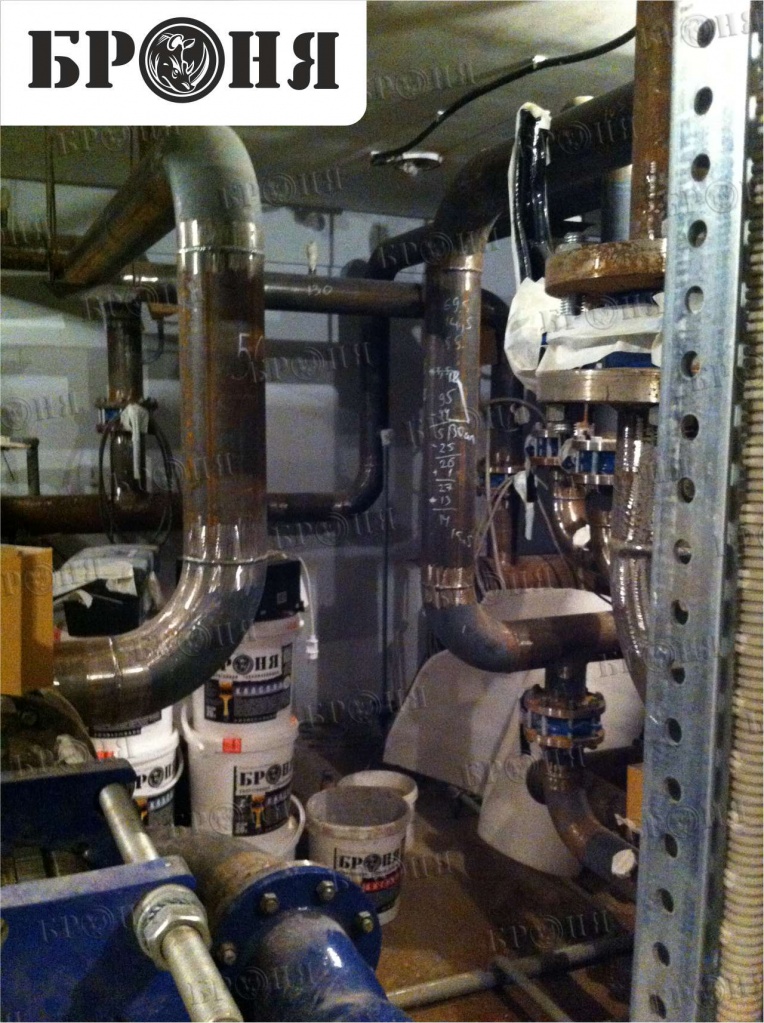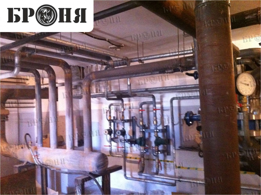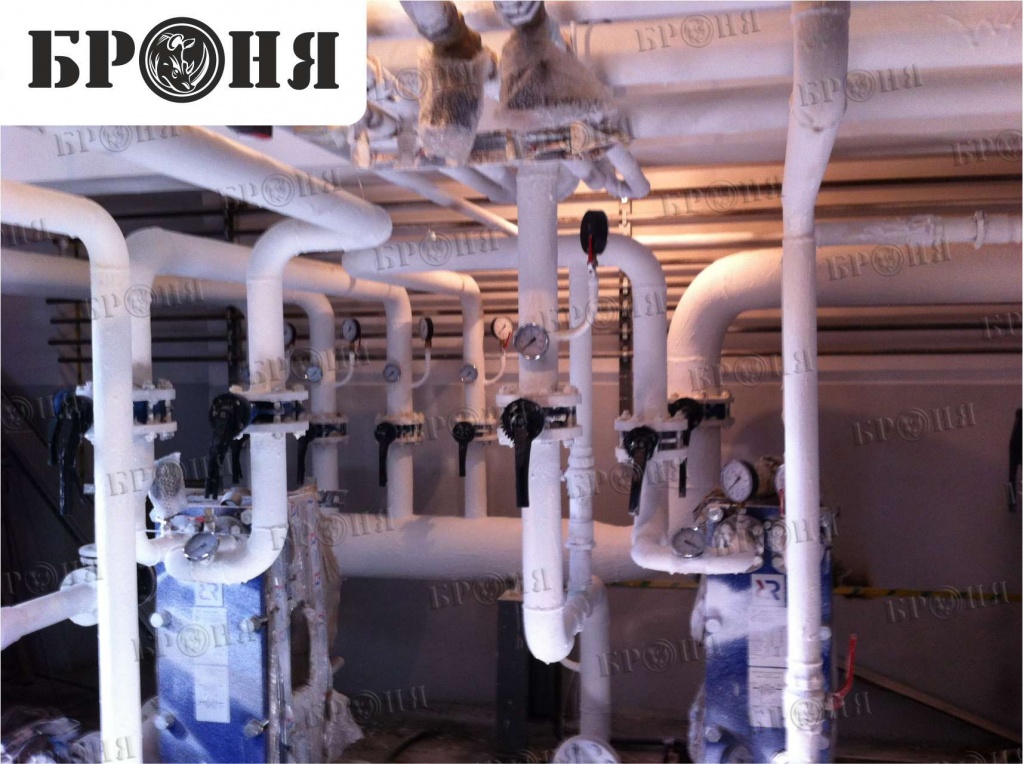 We present to your attention a photo report on the application of Bronya thermal insulation in the "Chaika" multi-story residential building. The Bronya Antirust, Bronya Classic, and Bronya Winter modifications were applied to the pipelines for domestic and drinking water, fire protection, cold water supply, heating, hot water risers, and individual heating units. The total insulated area was approximately 1,000 square meters. The building was accepted by the commission and put into operation on May 5, 2015.