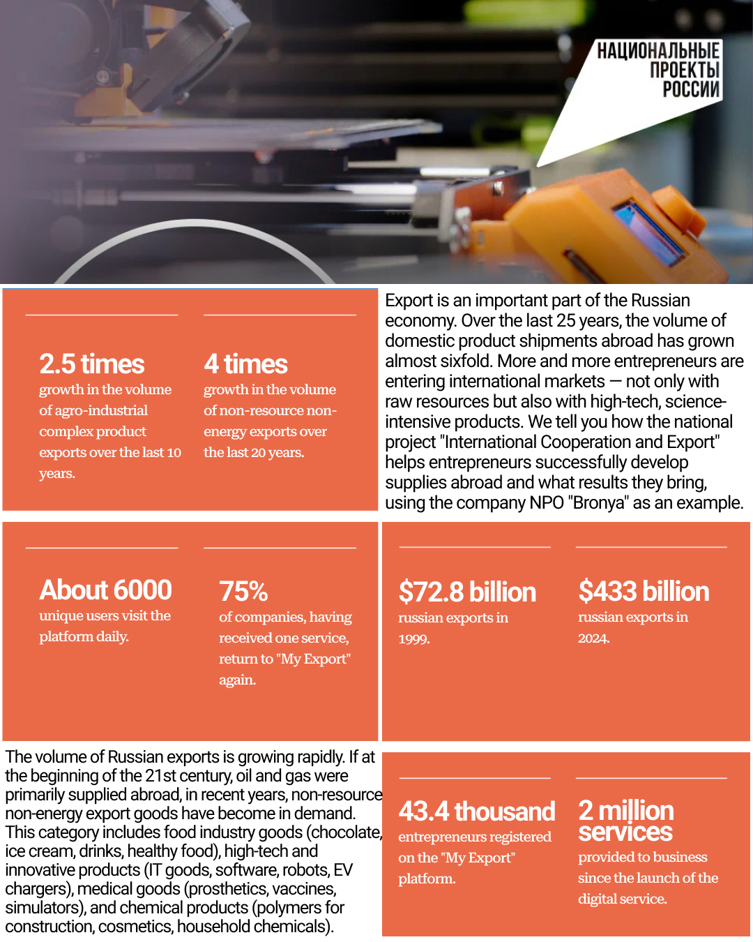 Background: The interview took place following the forum at the "Russia" National Centre, where NPO Bronya was recognized as one of the country's best exporters. This event confirms an important trend of the last 25 years: Russian exports are transforming, shifting from raw materials to science-intensive products. The driver of this process is the "International Cooperation and Export" national project.