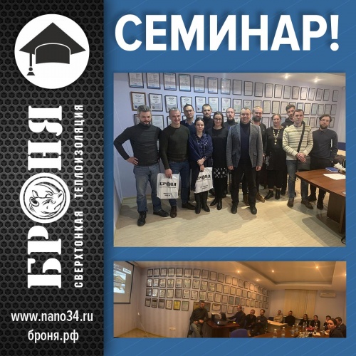 Речь на семинаре шла о современных покрытиях, разработанных НПО «Броня» - сверхтонкой теплоизоляции, гидроизоляции. Докладчиками были – генеральный директор НПО «Броня» Бояринцев Александр Валерьевич, и Михаил Юрьевич Олейников исполнительный директор по Волгоградской области Автономной некоммерческой организации "Центр экспертиз и контроля объектов наследия и культурных ценностей".