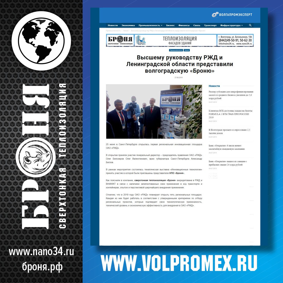 Статья об участии Теплоизоляции Броня в открытии первой региональной инновационной площадки ОАО «РЖД» на портале ВолгаПромЭксперт.