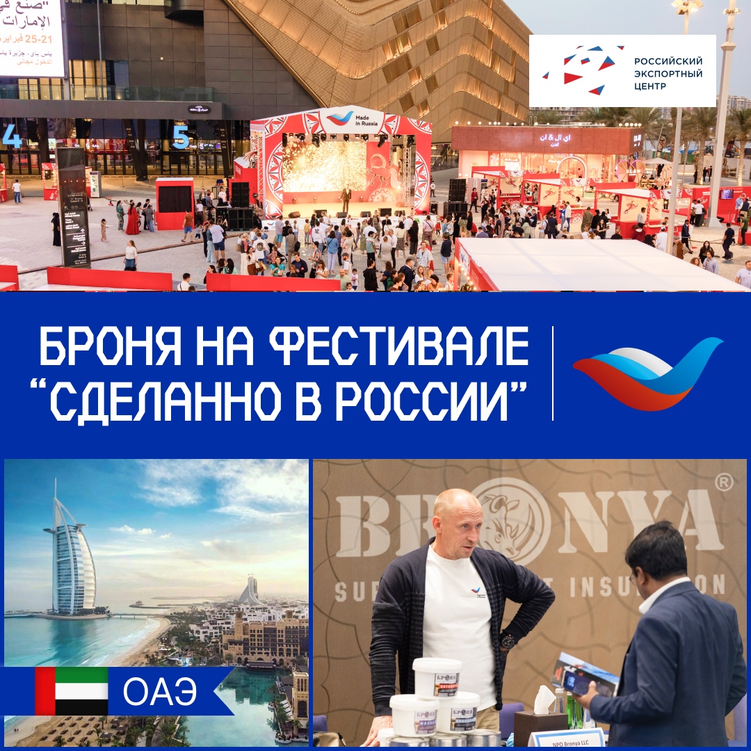 Броня продолжает уверенно завоёвывать зарубежные рынки! 21 по 25 февраля в Абу-Даби, мы приняли участие на ярмарке-фестивале "Сделано в России" в ОАЭ, собравшей 80 производителей из 30 регионов России чтобы представить широкой аудитории продукцию, от съестных деликатесов и косметики до инновационных строительных материалов. Для нас это не просто участие в мероприятии под брендом "Сделано в России», сертификатом которым мы имеем право маркировки, а еще один важный шаг в укреплении позиций на восточном и ближне восточном рынке! Броня уже несколько лет успешно поставляется в Бахрейн, Кувейт, Оман, Саудовскую Аравию, а последние три года «Броня Дубай» активно закупает Броню контейнерными партиями в ОАЭ.