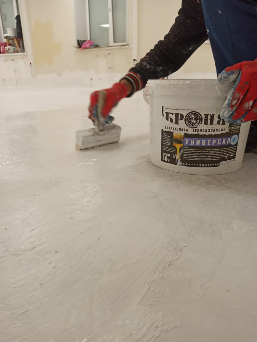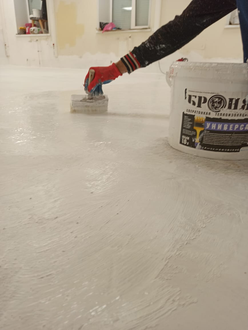 Во всех помещениях первого этажа, на предварительно обеспыленные поверхность был нанесен грунт Броня Концентрат, после 2 мм за 4 слоя Броня Универсал, 2 слоя по 1 мм Броня Лайт, а через двое суток уже был уложен линолеум.