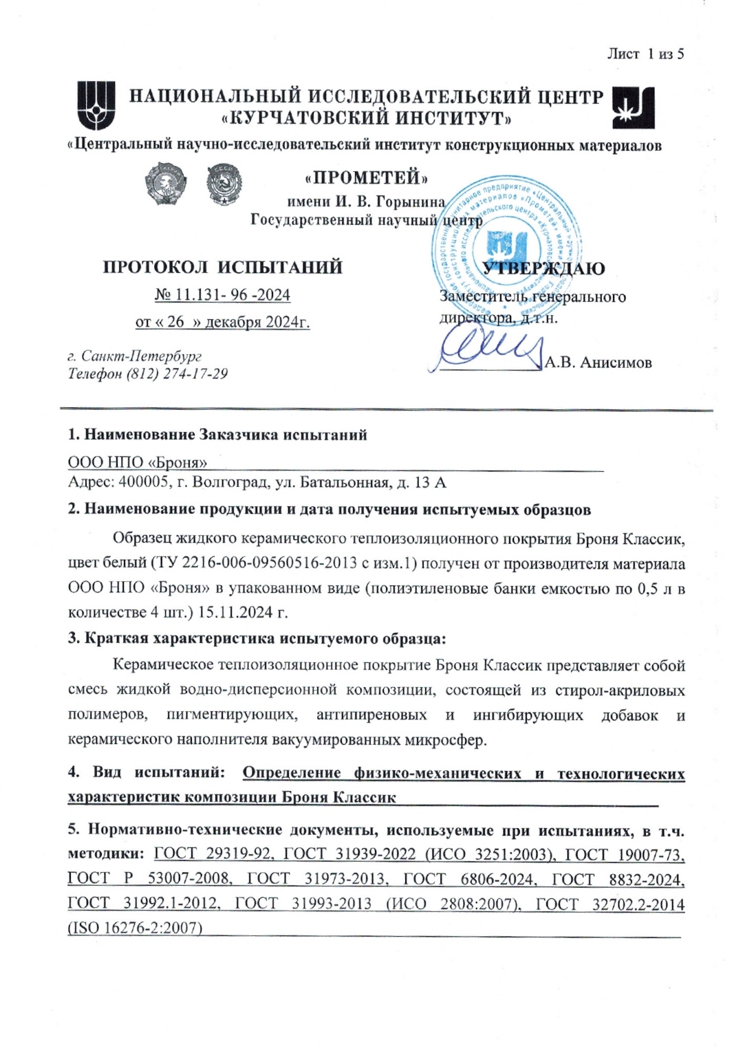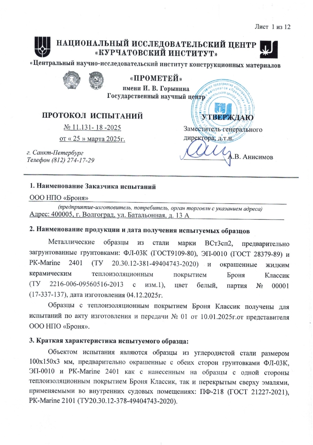 Физико-механические характеристики и совместимость с судовыми покрытиями «Броня Классик»: испытание НИЦ "Курчатовский институт" — ЦНИИ КМ "Прометей" (Сканы заключений)
