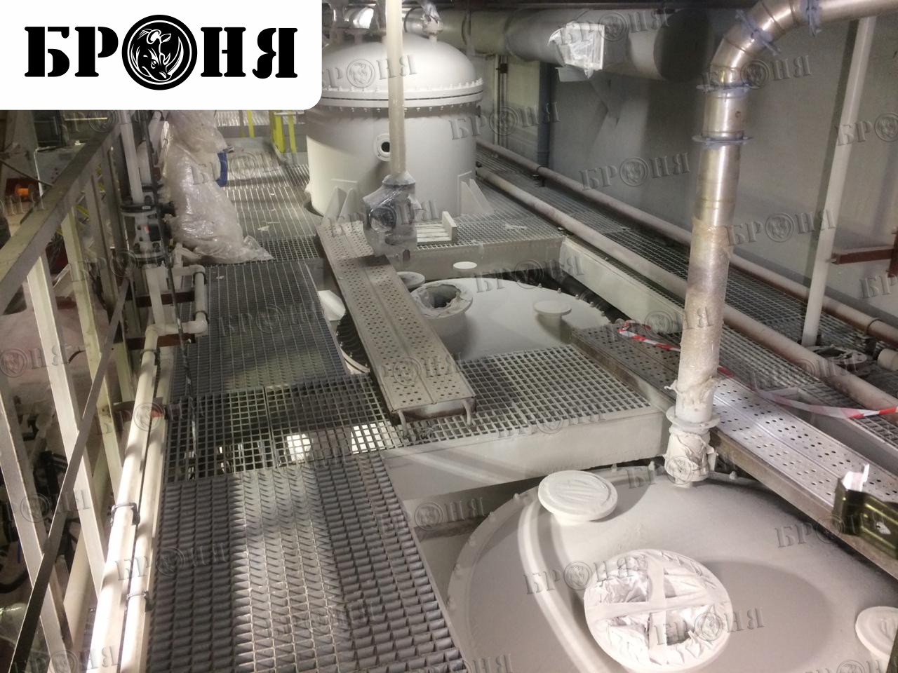Представляем вам фотоотчет о применении Теплоизоляции Броня на горно-металлургическом производстве по добыче сульфидных медно-никелевых руд и производству цветных металлов АО "Кольская ГМК" (дочернее предприятие ПАО «ГМК «Норильский никель») в Мурманской области. Для теплоизоляции нескольких типов емкостного оборудования применен зарекомендовавший себя годами и множеством успешно теплоизолированных объектов тандем - Броня Антикор + Броня Классик, а именно их НЕгорючие модификации Броня Антикор НГ (1 мм) + Броня Классик НГ (1,5 мм), работы производились аппаратом безвоздушного распыления. В проекте теплоизолирования оборудования помимо требования к негорючести материалов, была прописана необходимость к периодической мойке оборудования и устойчивости покрытия к физическому воздействию, в связи с этим было принято решение об использовании поверх Теплоизоляции Броня полиуретановой эмали, но прямое нанесение эмали на Теплоизоляцию Броня привело бы к ухудшению теплофизических свойств покрытия. Поэтому в качестве разделительного слоя была применена Теплоизоляционная шпаклевка Броня Лайт НГ толщиной слоя 1 мм. Важно отметить, что применение неимеющей аналогов Теплоизоляционной шпаклевки Броня Лайт в подобных случаях не только экономически выгодное решение, но и необходимость, т.к. поверх Теплоизоляции Броня не рекомендуется нанесение защитных и декоративных покрытий без разделительного слоя.