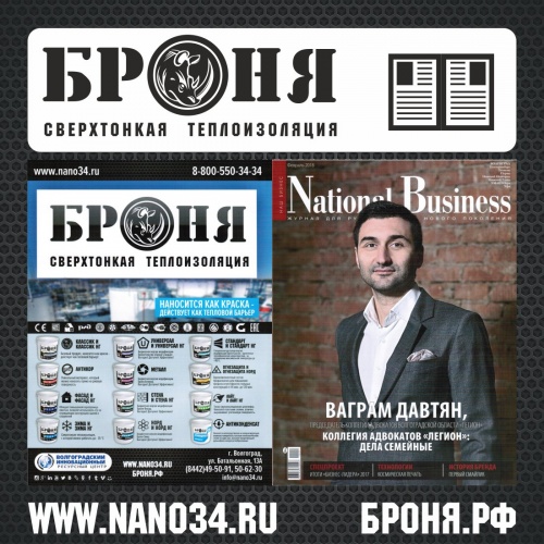ГК ВИРЦ Броня постоянно сотрудничает с популярными глянцевыми изданиями, одним из которых является журнал National Business - журнал о секретах успеха бизнес-лидеров, философии и принципах, правилах и приемах в работе, которые и сделали их самыми успешными людьми региона. Уже традиционно 4-ю обложку журнала занимает Теплоизоляция Броня, а внутри издания размещается информационная статья о продукции компании.