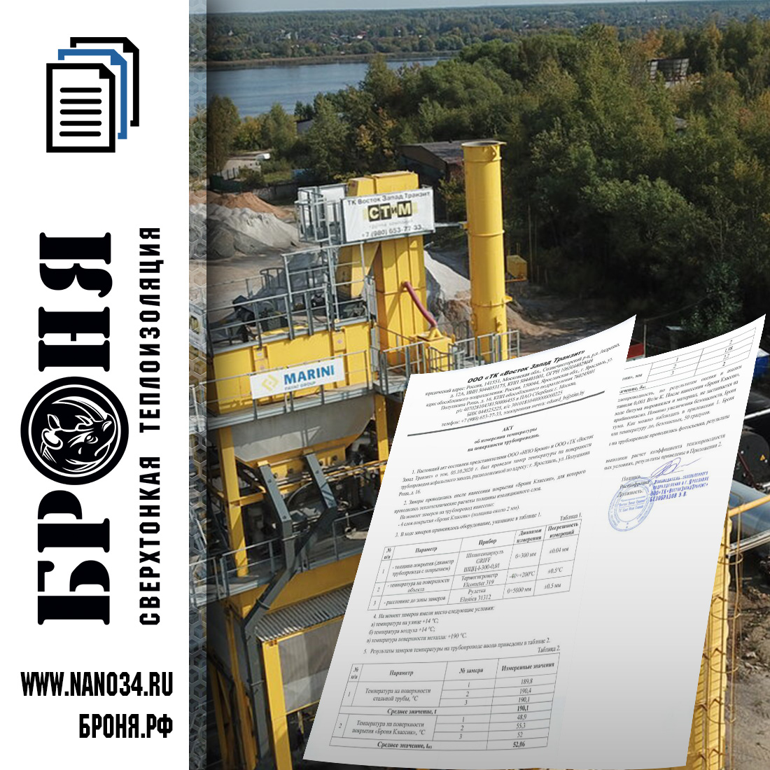 Новый акт, составленный представителями ООО "НПО Броня" о том, что ООО "ТК" Восток Запад Транзит" было проведено испытание с теплоизоляцией Броня на поверхности трубопроводов асфальтного завода по адресу: г. Ярославль, ул. Полушкина Роща, д.16.