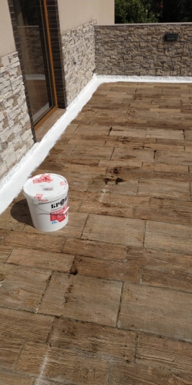 Представляем вам фото и видеоотчет применения Броня Акваблок эффект при гидроизоляции террасы частного дома, село Лермонтово, Краснодарского края на побережье черного моря, закрытое поселение Резиденция Солнца. Примыкания пройдены гидроизоляцией броня Акваблок эффект с геотекстилем. Предварительно плитка обработана модификатором поверхности. На плитку нанесено два слоя гидроизоляции.