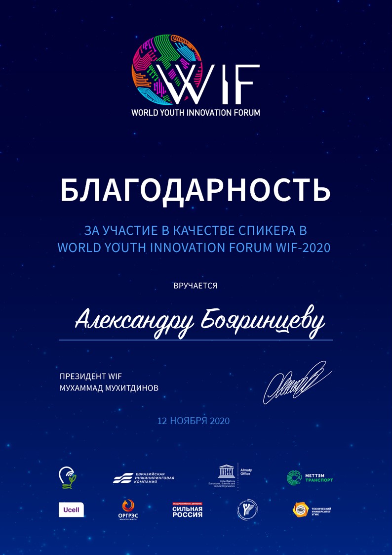 Форум WIF-2020 организован совместно с Innoweek-2020 (Узбекистан). Генеральными партнерами мероприятия стали государственные и частные организации, нацеленные на поддержку молодежных проектов: Министерство инновационного развития Узбекистана, Евразийская инжиниринговая компания, ЮНЕСКО (офис Алматы), UCELL, Ассоциация общественных объединений «Национальный Совет молодежных и детских объединений России», ГК «МЕТТЭМ-ТРАНСПОРТ», общероссийское движение «Сильная Россия».