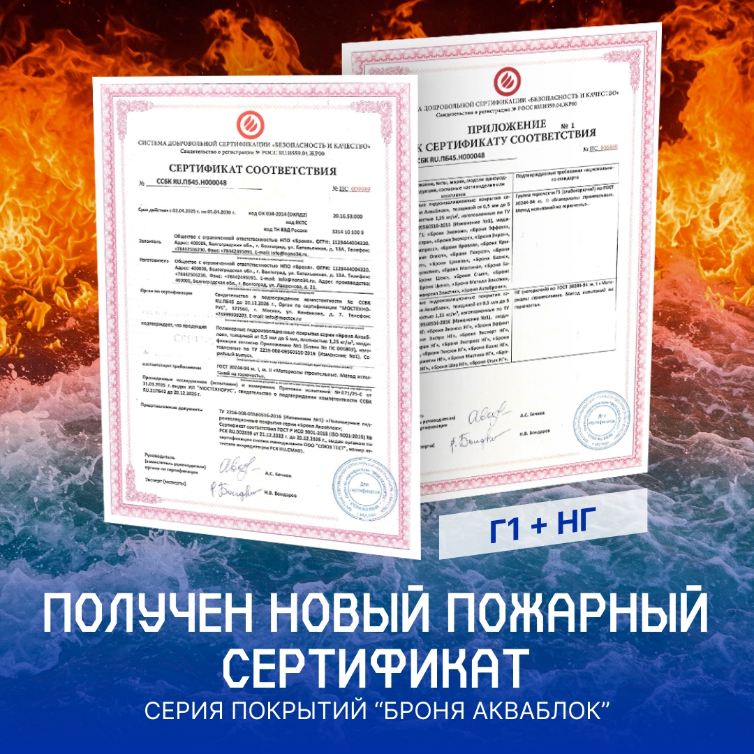 Важно! Продление обновление Пожарного сертификата на линейку продуктов Броня Акваблок Г1 + НГ (скан серт)