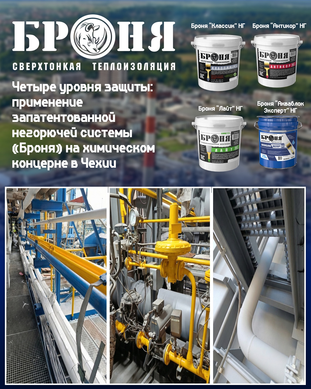 Заказчиком выступил один из крупных химических концернов Чехии — наш давний партнер и клиент , который уже применял покрытия «Броня» на своих промышленных объектах. В этот раз перед нами стояла нетривиальная задача: требовалось не просто утеплить трубопроводы, но и обеспечить антикоррозийную защиту, абсолютную негорючесть (НГ) и, главное, стойкость к агрессивной воздушной химической среде предприятия. Для решения задачи была применена наша запатентованная многослойная система, включающая четыре модификации покрытия: