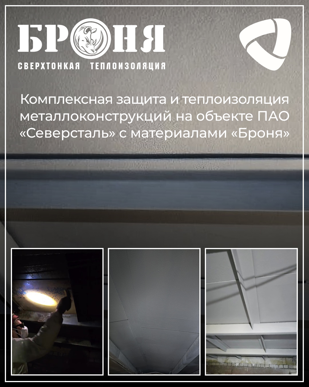 Делимся отличными новостями и свежими кадрами от нашего дилера из г. Череповец! На объекте промышленного гиганта ПАО «Северсталь» (КАДП. СБК-1, Здание администрации кокса Аглодоменного производства) успешно завершены работы по теплоизоляции и антикоррозийной обработке несущих металлических конструкций покрытия. Особо хочется отметить, что наш региональный представитель успешно сотрудничает с данным предприятием уже более семи лет. Примечательно то, как эволюционировал масштаб применения наших покрытий на объектах заказчика: если на начальных этапах партнерства материалы «Броня» применялись преимущественно для точечных задач (изоляции трубопроводов, узлов оборудования, устранения мостиков холода и локальной борьбы с конденсатом), то сегодня клиент уверенно расширил спектр применения наших модификаций, доверяя им комплексную обработку целых несущих конструкций зданий.