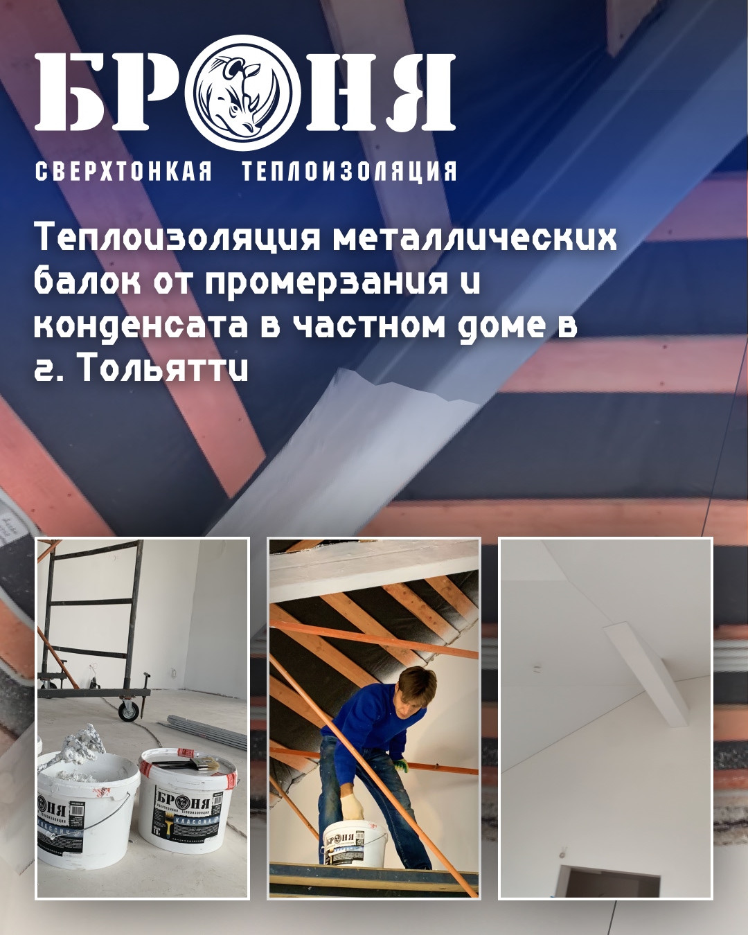 Для выполнения задачи была выбрана сверхтонкая теплоизоляция Броня Классик. Этот базовый продукт линейки наносится как краска, но действует как мощный тепловой барьер, что делает его идеальным для обработки сложных геометрических форм, таких как балки перекрытия.